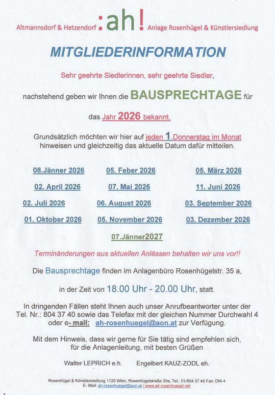 In diesem Zeitraum steht Ihnen der Leiter des Bauausschußes „Rosenhügel-Künstlersiedlung“ Herr Walter Leprich mit seinem Team zur Verfügung und Sie haben die Möglichkeit Ihre Anfragen direkt zu stellen und auch die entsprechenden Antworten und Lösungsvorschläge zu erhalten, zumal Herr Leprich mit seinen Mitarbeitern über sämtliche Informationen, betreffend Ausbaubestimmungen, Siedlungstypen, Ausbaukonzept der :ah!, in Verbindung mit den Bebauungsbestimmungen seitens der MA 21, verfügt.